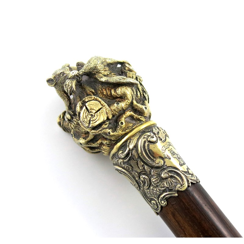 modelled as a fox killing a bird in a woodland setting, with foliate scroll mounts, engraved with a crest and initials, tapering wooden shaft, length 87.4cm.