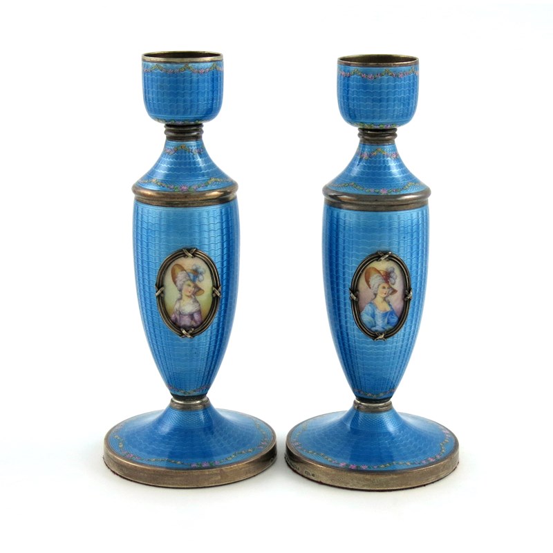 A pair of Austrian silver and enamel candlesticks