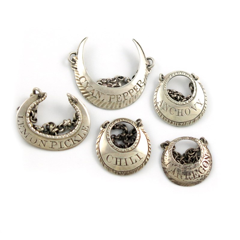comprising: crescent form, incised 'LEMON PICKLE', 'ANCHOVY', 'TARREGON', 'CHILI' and 'CYAN PEPPER', approx. weight 0.5oz. (5)