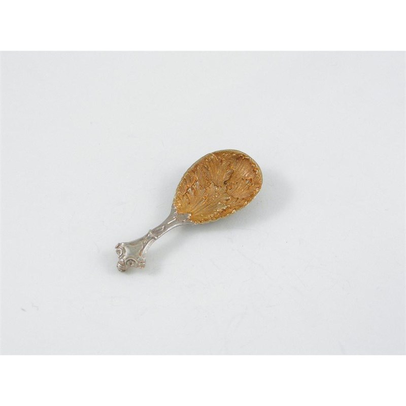 A Victorian cast caddy spoon, with foliate decoration, a gilt bowl and a shaped stem with a vacant cartouche, by George Adams, London 1851.