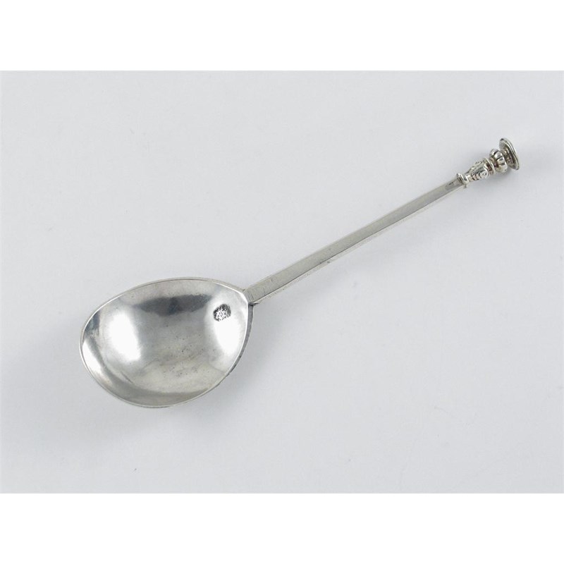A commonwealth seal top spoon, with a gilt terminal, pricked "MD" over "1657", maker's mark "II", probably by Jeremy Johnson, London 1657, 6.75in (17cm), 1.5oz.