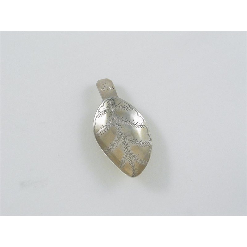A George III 'leaf' caddy spoon, with engraved vines in the bowl, the lug handle initialled "S" over "WM", by Matthew Linwood, Birmingham 1807.
