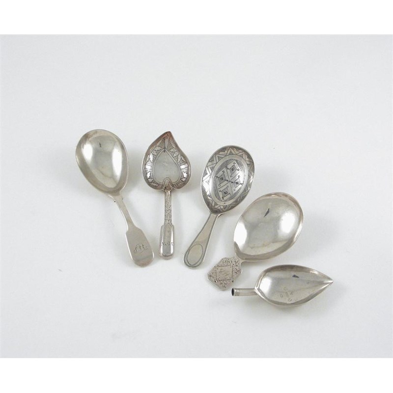 Five caddy spoons: a Victorian fiddle example, a George III example with bright-cut lug handle, a George III example with "pricked" work, an engraved example with hollow fiddle stem, and a George III bowl only. (5)