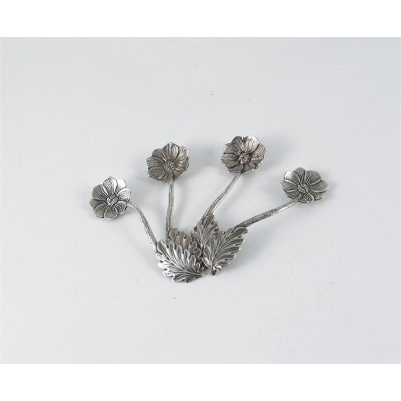 Four naturalistic salt spoons, modelled as daisy flowers, (one pair maker "EK" London 1975, one unmarked and one London 1880). (4)