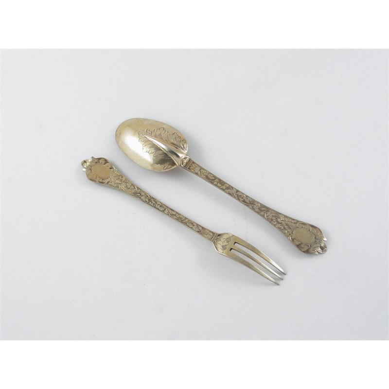 A William III engraved silvergilt trefid spoon and fork, with vacant oval cartouches on the front and back of the stems, the spoon with a ridged rattail flanked by foliage, unmarked 1695-1700, the spoon 8in (20.3cm) long, 2.25oz. (2)