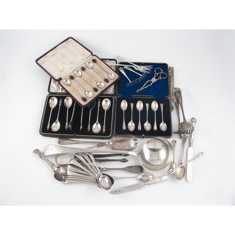 A mixed lot of flatware and cutlery: a cased set of 6 modern apostle teaspoons and a pair of sugar tongs, a cased set of 6 bean-end coffee spoons, a cased set of 6 coffee spoons, a Victorian soup ladle, 14 teaspoons, 5 assorted pair of sugar tongs, a pair of sugar nips, 2 child's pushers, 3 knives, a salad fork, and three small forks, 40oz weighable silver. (lot)