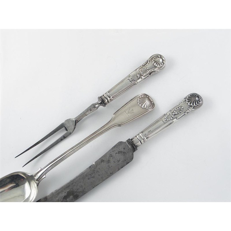 A Victorian basting spoon, fiddle thread and shell pattern, crested, by S. Hayne & D. Cater, London 1860 together with a steel carving fork and knife with Kings pattern handles (the fork handle plated), 6oz weighable silver. (3)
