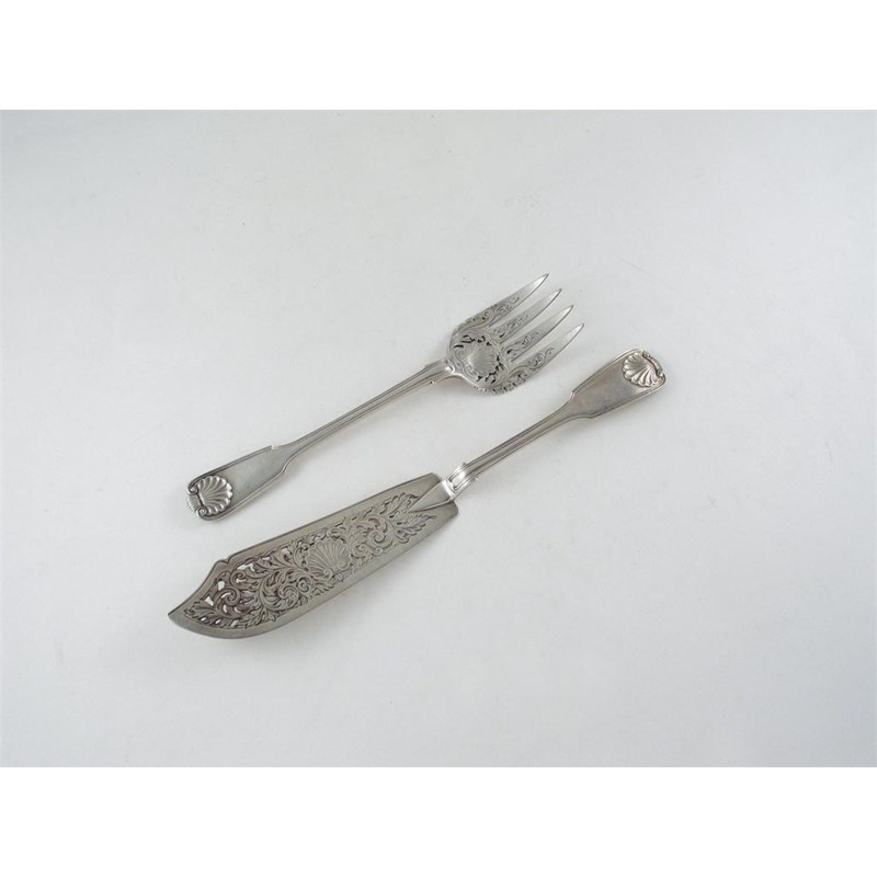 A Victorian fish serving knife and fork, fiddle thread and shell pattern with engraved and pierced blade and tines, initialled, by George Adams, London 1867, 11oz. (2)