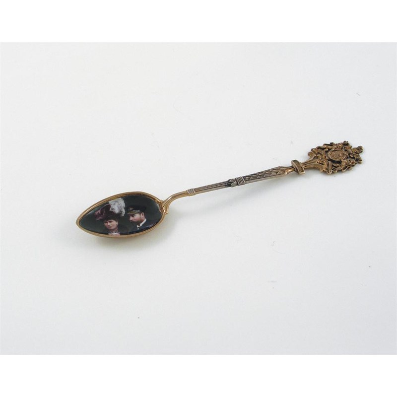 A silvergilt and enamel 'souvenir' teaspoon, with the dual portrait of King George V and Queen Mary in the bowl, with English import marks for London 1910.