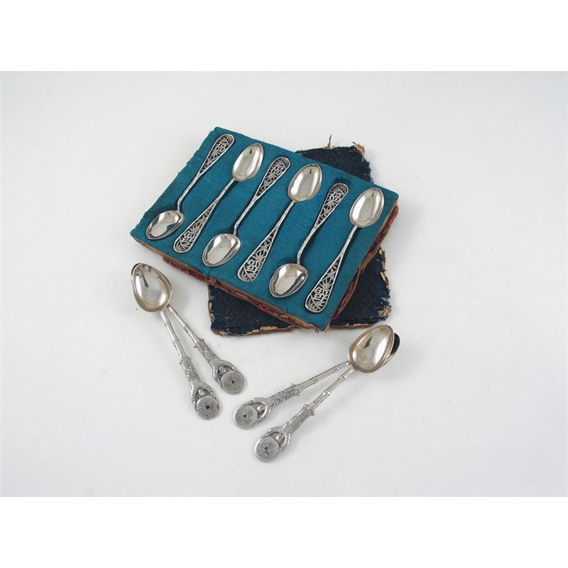 Chinese Export: a set of four early 20th century teaspoons, with figural terminals by Luen Wo, Shanghai c.1900, and a set of six bamboo design teaspoons, by Hung Chong & Co Shanghai c.1900 (in a damaged case). (5)