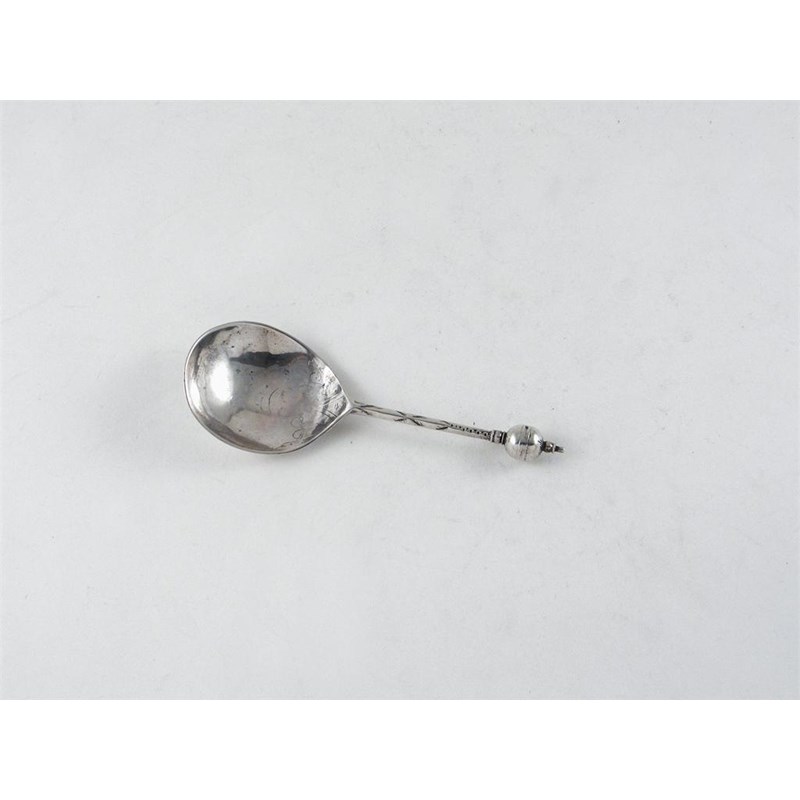 A 17th century Norwegian spoon, with a ball knop, and a partly-engraved bowl maker's mark only struck twice, (worn), possibly by Jochim/Jochum Haveman, Christiania, mid 17th century, 5.5in (14cm), 0.75oz.