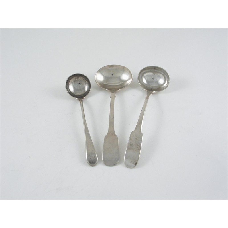 Three rare small ladles: a George III Scottish provincial fiddle toddy ladle, by David Issat, Baiff (maker's mark only), a George III Irish cream label, initialled "C", by Andrew Goodwin, Dublin (maker's mark only), and a William IV provincial sauce ladle, by George Lowe, Chester 1836, oz. (3)