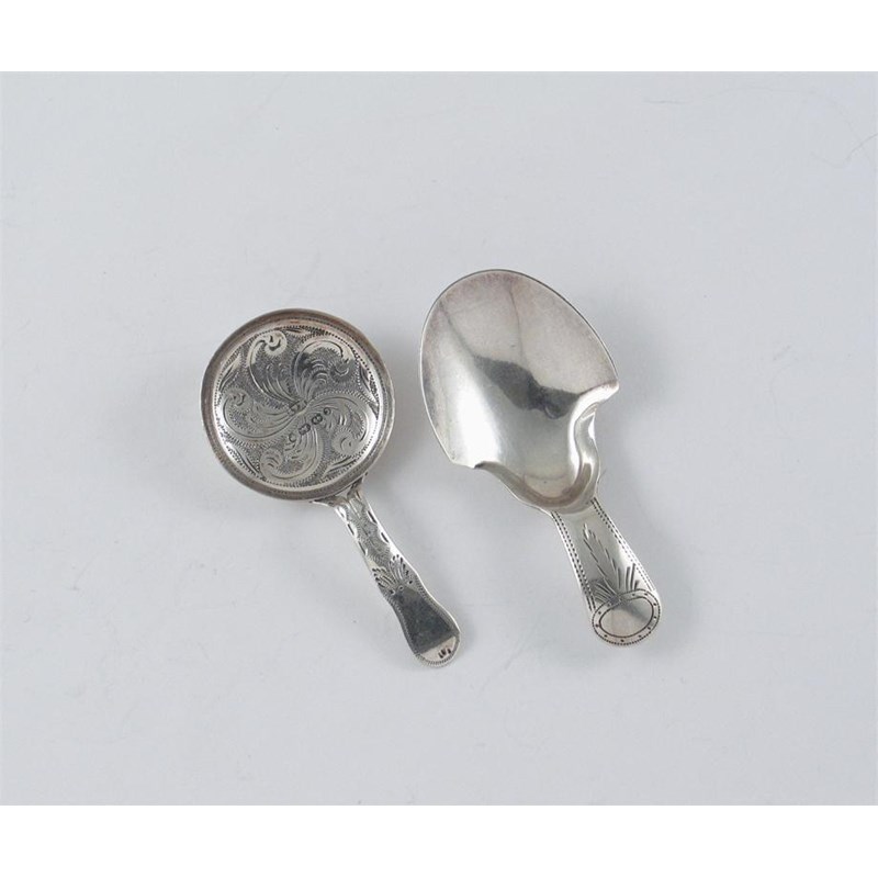 A Victorian engraved caddy spoon, with bifurcated stem, by Hilliard & Thomason, Birmingham 1877, together with, a George III caddy spoon with engraved stem, by Joseph Taylor, Birmingham 1802. (2)