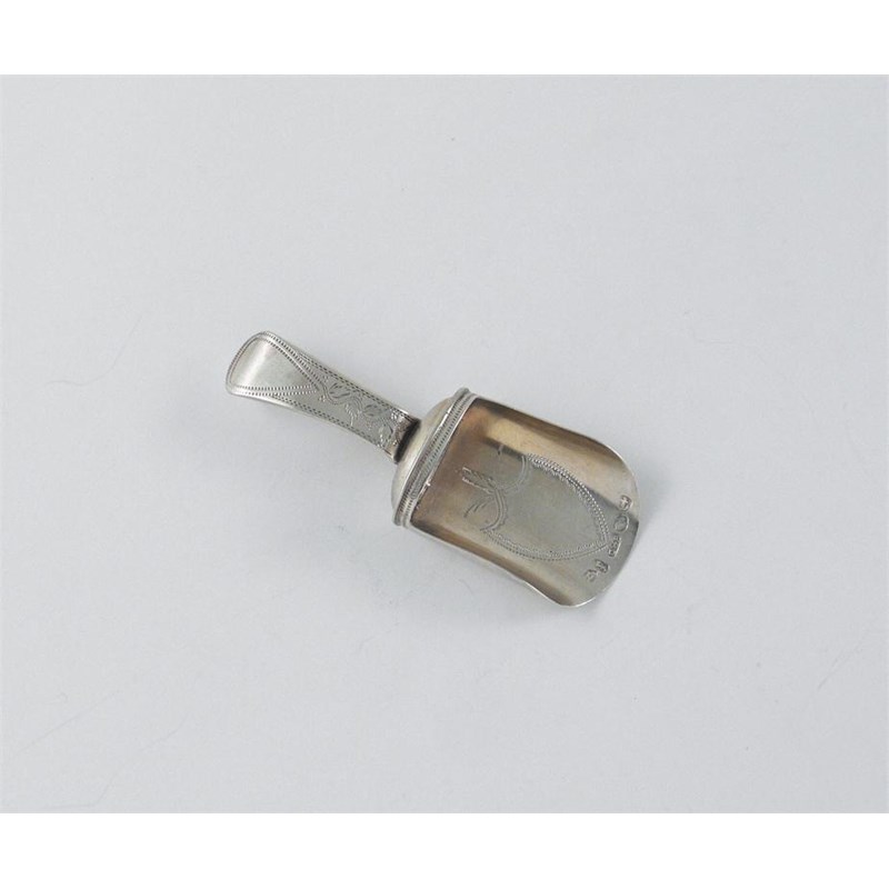 A George III caddy scoop, with pricked decoration, and vacant shield shaped cartouche, by Cocks & Bettridge, Birmingham 1805.