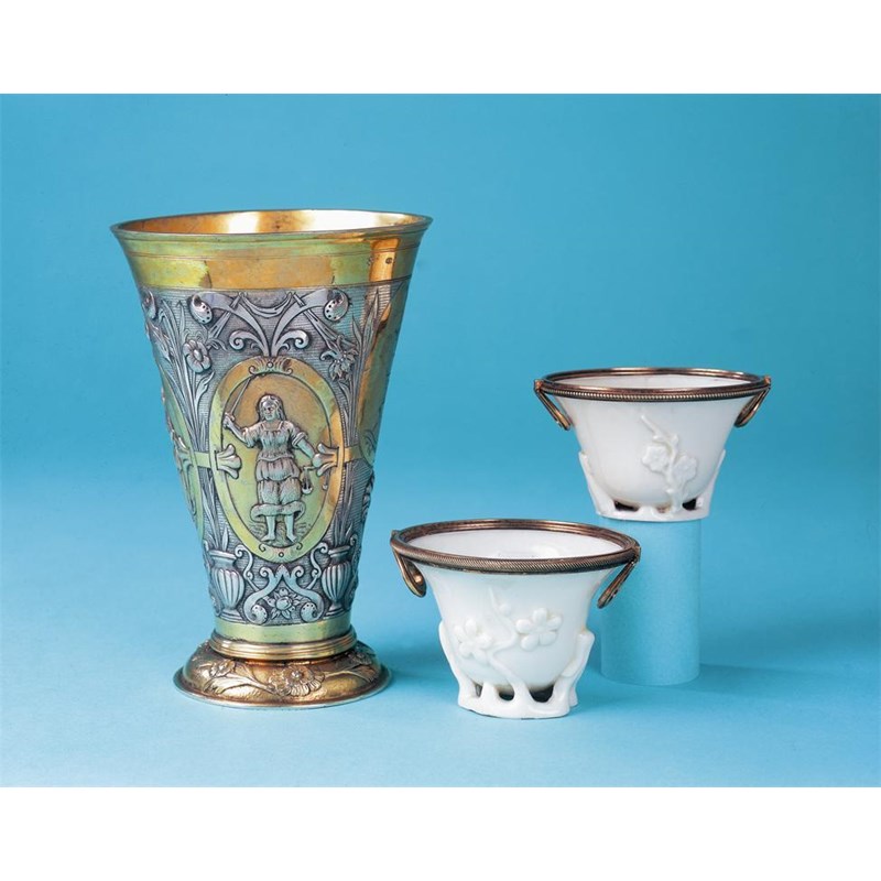 A pair of unusual, late Victorian arts & crafts candlesticks, mounted "Doulton Lambeth Silicon" pottery imitating rivetted copper with domed bases and drip pans, maker Henry Titterton Brockwell, London 1892, 7.2in (18cm) high. (2)