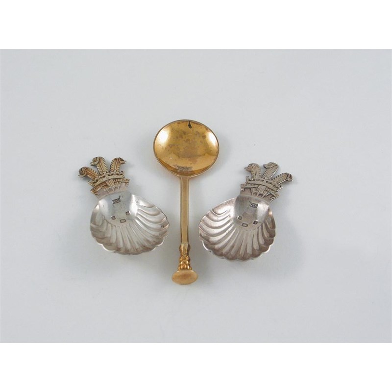 Two modern commemorative caddy spoons, with the Prince of Wales's feathers terminal, by Roberts & Belk, Sheffield 1981 and a Victorian silvergilt sealtop caddy spoon, crested, by George Adams, London 1867. (3)
