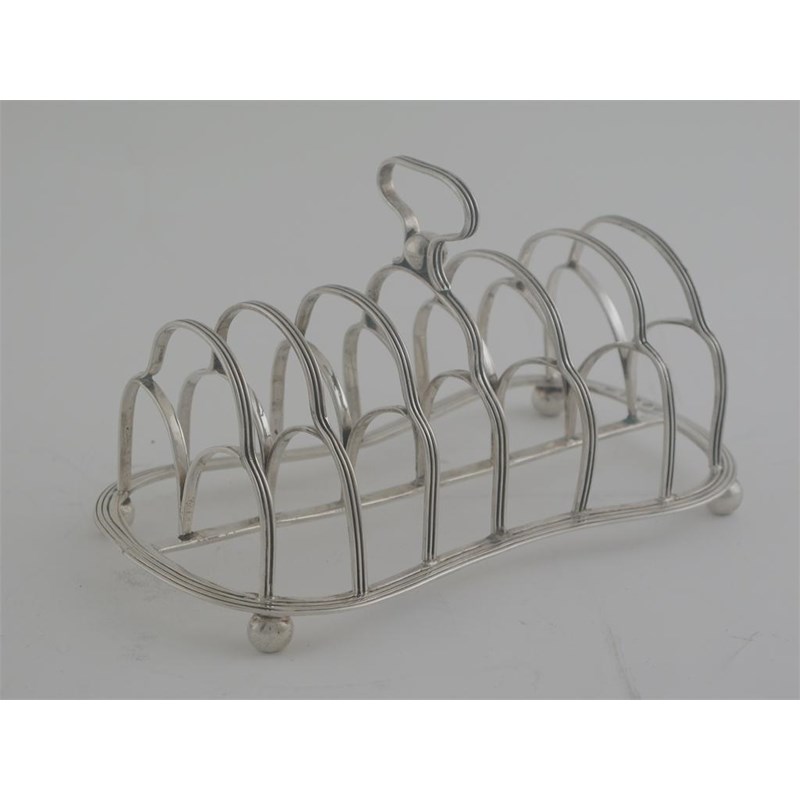 A George III reeded toast rack, of waisted outline with seven arched bars and ball feet, by Solomon Hougham, London 1816, 6.5in (16.5cm) long, 5.5oz.