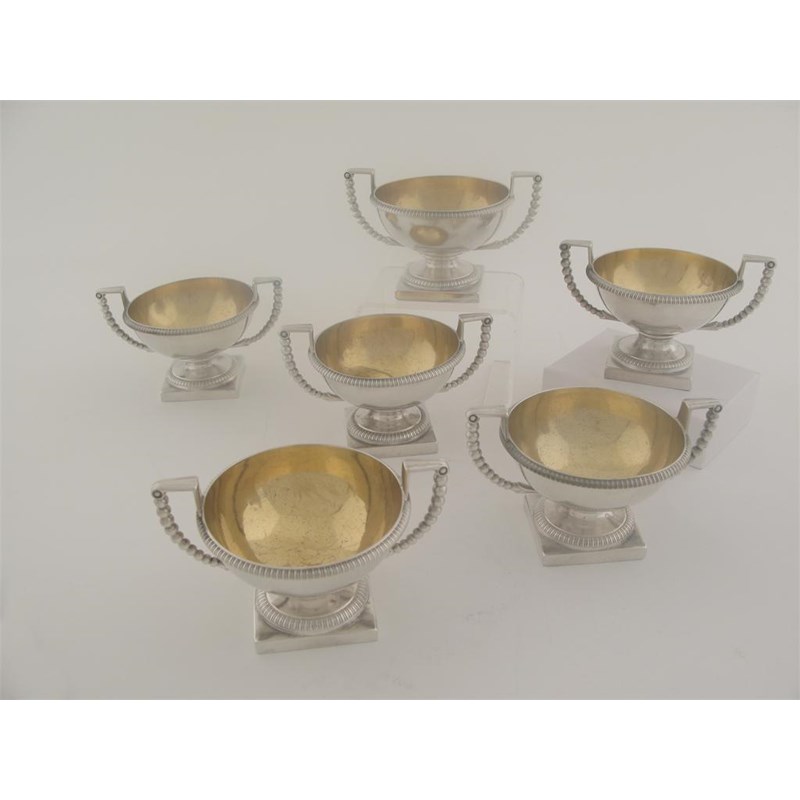 A set of six George III circular salts, on square pedestal bases with fine-gadrooned borders and angular handles decorated with a row of graduated beads gilt interiors, Peter Podio, London 1806, 3.3in (8.5cm) diameter, 26.5oz. (6)