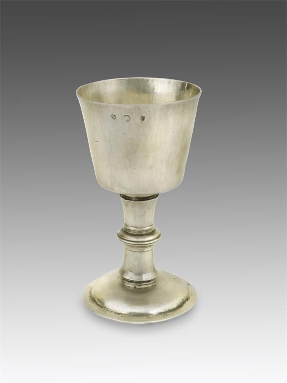 An early 17th century wine goblet, on a low-domed, circular foot with a knopped, waisted cylindrical and a plain, flared bowl, maker's mark only "IC" in a shaped shield, with a mullet [stuck twice on the bowl and twice on the foot] and once on the bowl, with a turret mark and the initials "LG", unascribed 1620-1640, 6.6in (16.8cm) high, 8.5oz.