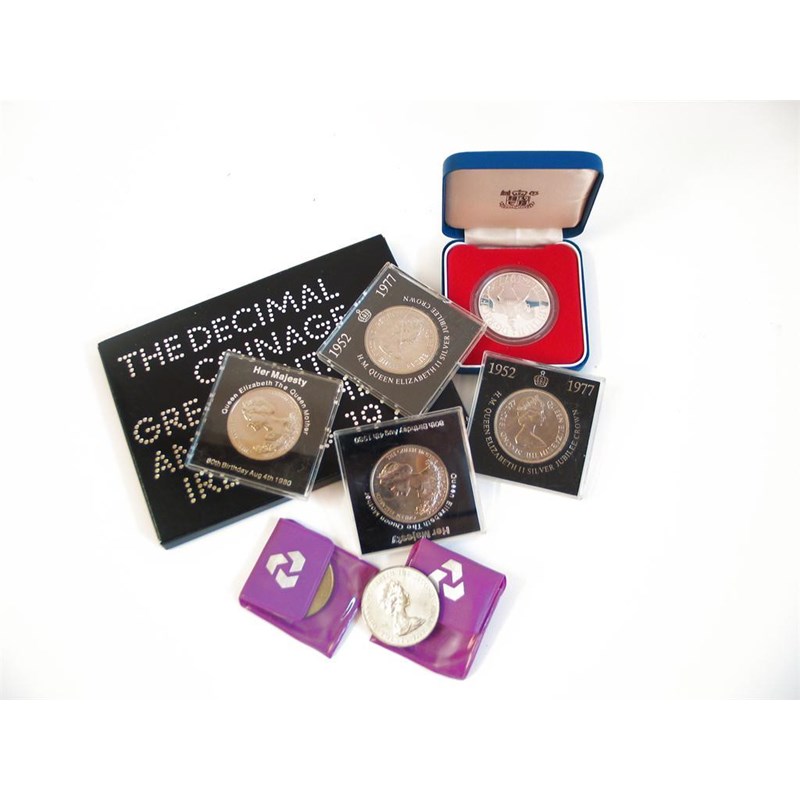 Elizabeth II, Maundy set, 1971, in case; George V, Halfcrown, 1935, in card presentation box, these extremely fine; Guernsey, proof sets (2) 1971, 1985; various proof crowns (4), sets (2) and sundry cased crowns and Guernsey 10-Shillings, etc. (lot)