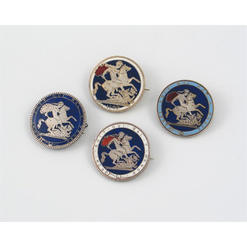 George III and George IV, enamelled Crowns (4), variations of the Pistrucci St. George in silver against dark blue, all brooch-mounted. All enamel in excellent condition. (4)