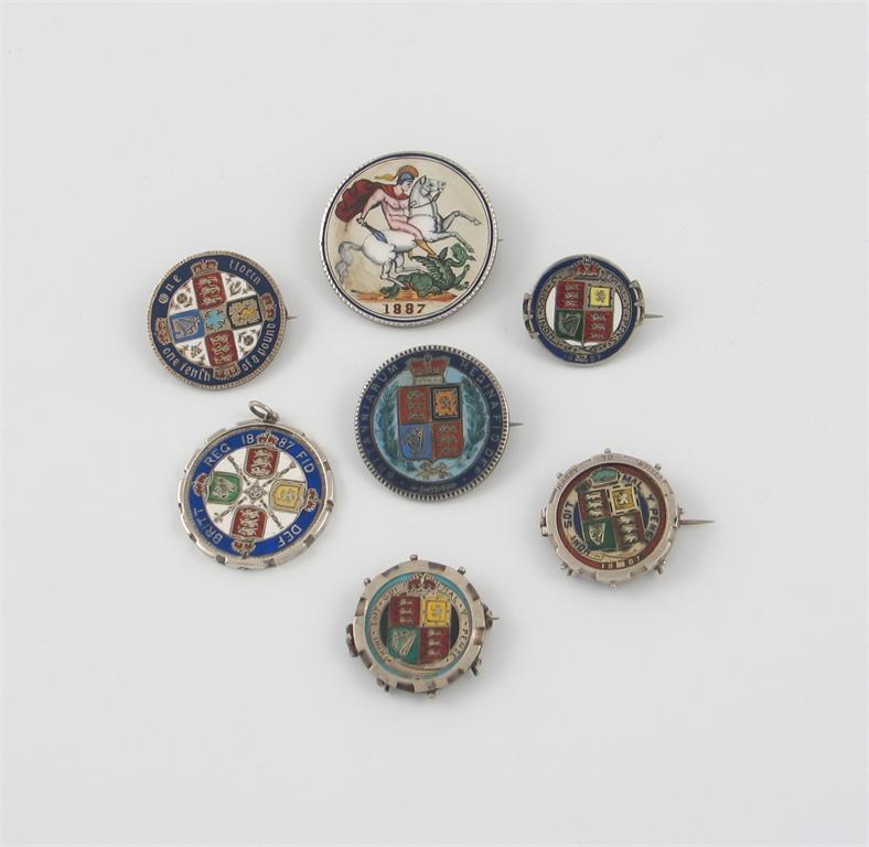 Victoria, enamelled coins (7), reverses only, Young Head Halfcrown 1875; Gothic Florin, 1873; Jubilee 1887, Crown, 'painted' on silver; Florin and Shillings (3), with brooch and other mounts. All enamel in excellent condition. (7)