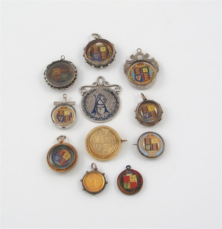 Victoria, Jubilee coinage, enamelled Shillings (4) and Sixpences (4), all in glazed mounts (one Sixpence damaged); gilt Shilling brooch; gilt Threepence, glazed mount; George III, Halfcrown, stippled and with enamelled initials AR. Generally in very good condition. (11)