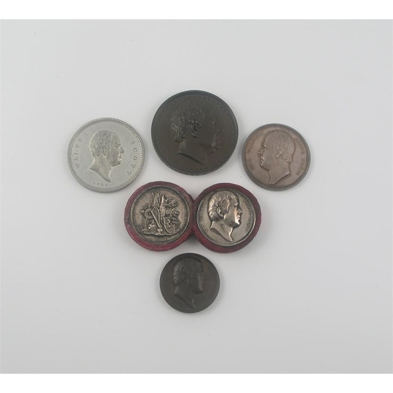Sir Walter Scott (1771-1832), a collection of medals relating to the author:- 50th Birthday 1821, by T. Webb and B. R. Faulkner, for J. Mudie, 40mm; with separate silver clichés of the obverse and reverse, in curious holder; complimentary white metal medal, 1824, by William Wyon for Sir Edward Thomason, , with reverse figures of Truth and Fiction, 53mm, complimentary copper medal, 1824 by A. J. Stothard for Parker's series of "Great Men", 62mm; and for his death, silver, [1832], by W. Bain and B. R. Faulkner with reverse, The Lady of the Lake, 50mm. The clichés very fine, others all better and last scarce. (5)
