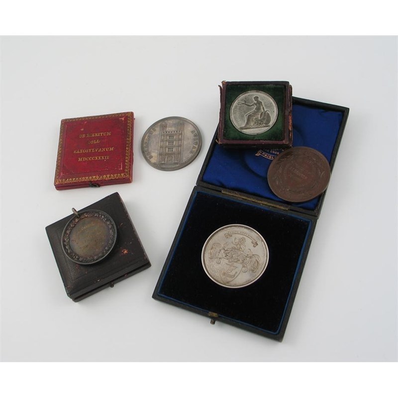 Educational Prize Medals, Stonyhurst College, silver prize medal, issued in 1832, by T. Halliday, the tower entrance, rev legend, 43mm, in case of issue; other educational medals, Renfrew, County Scholarships 1900, silver medal (Edward Stuart Russell), engraved armorial design, 49mm, in case; Bognor Regis School, Regular Attendance 1901, silver (Rose Tadd), 44mm, in case; Carpenters' Company, King's College 1900, copper medal (A. E. Brooker), 48mm; and a cased white metal medal, 1867, 38mm, in case. Mostly extremely fine, first choice and rare. (5)