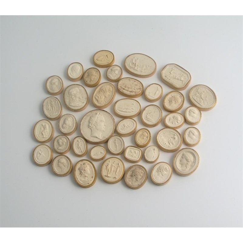 Georgian plaster seal and intaglio impressions, a collection of 38 pieces, each with card surround, British manufacture with several signed by Edmund Burch RA, W. Brown, but mostly Nathaniel Marchant, showing classical scenes (10), classical and later heads (18), , cherubs (5), dogs (3) and stags, and a later medal of Casimir Perier. Generally in excellent condition. (38)