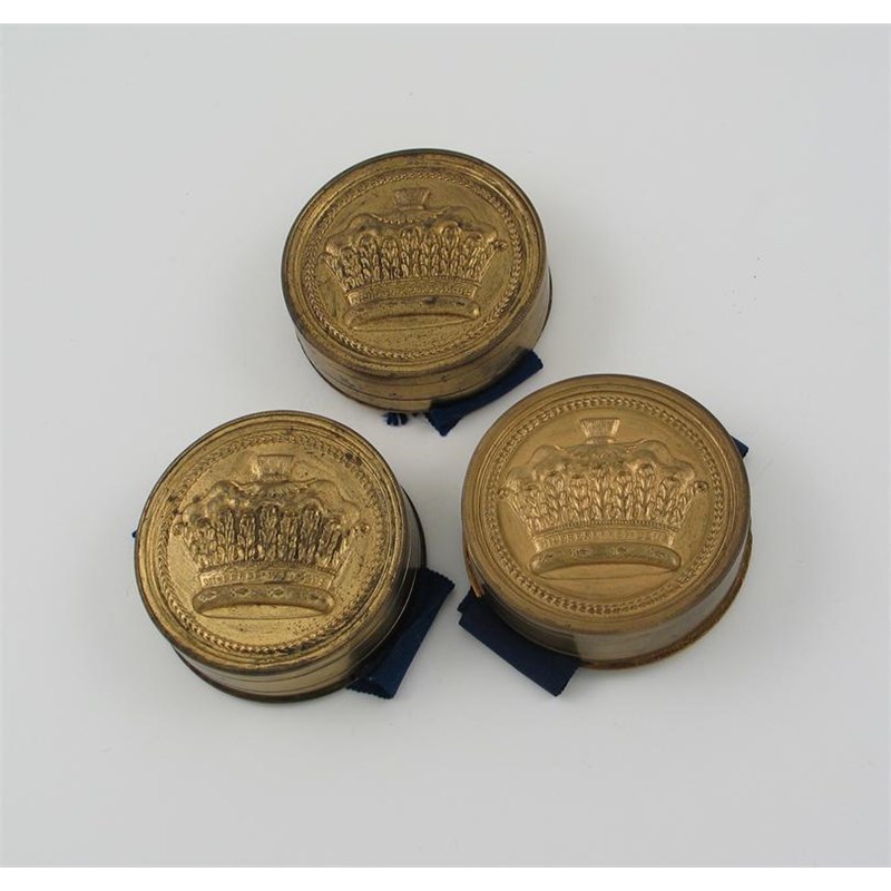 Grants of Arms, 19th century seal of the Garter King of Arms, vermilion wax, in brass protective skippet, this with coronet on cover, 70mm; others (2), Walter Aston Blount, Norroy King of Arms (1859-1882), and Robert Laurie, Clarenceaux King of Arms (1859-1882), in similar skippets. Attractive and in good order. (3)