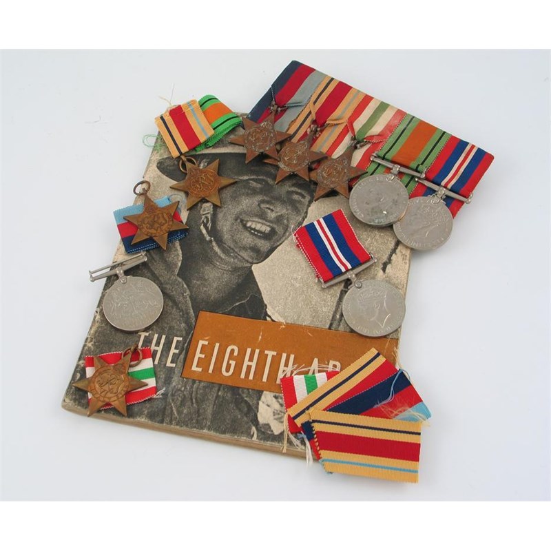 World War II, group of 5 medals, in box of issue to Mr. A. W. B. Ashwell, 1939-45, Africa (8th Army clasp), Italy Stars, Defence and War Medals; a similar unattributed group (but lacks clasp), mounted for wearing; booklet on 8th Army.