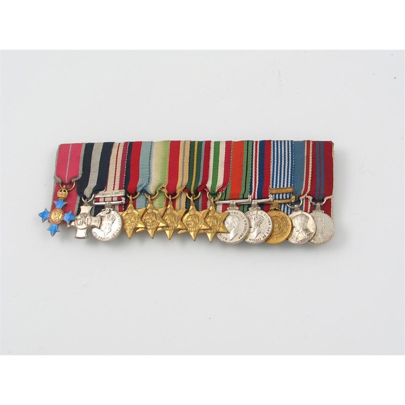 World War II, a Naval group of miniature medals, unattributed, C.B.E., D.S.O., Naval General Service, Palestine 1936-39; 1939-45, Atlantic, Africa, Pacific & Italy stars; Defence and War medals, UN Korea, Coronations 1936, 1953, mounted for wearing. Very fine.