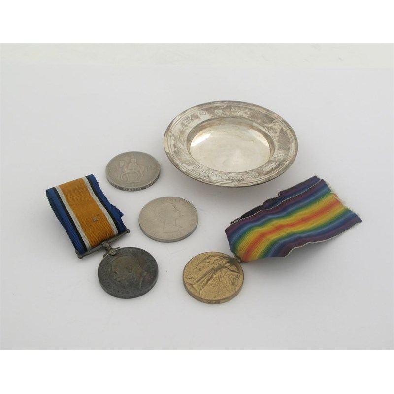 World War I, pair of medals, War and Victory (A-437783 Pte G. J. Lucas. A.S.C.), extremely fine; modern Crown pieces (2); and a small silver Armada Dish.