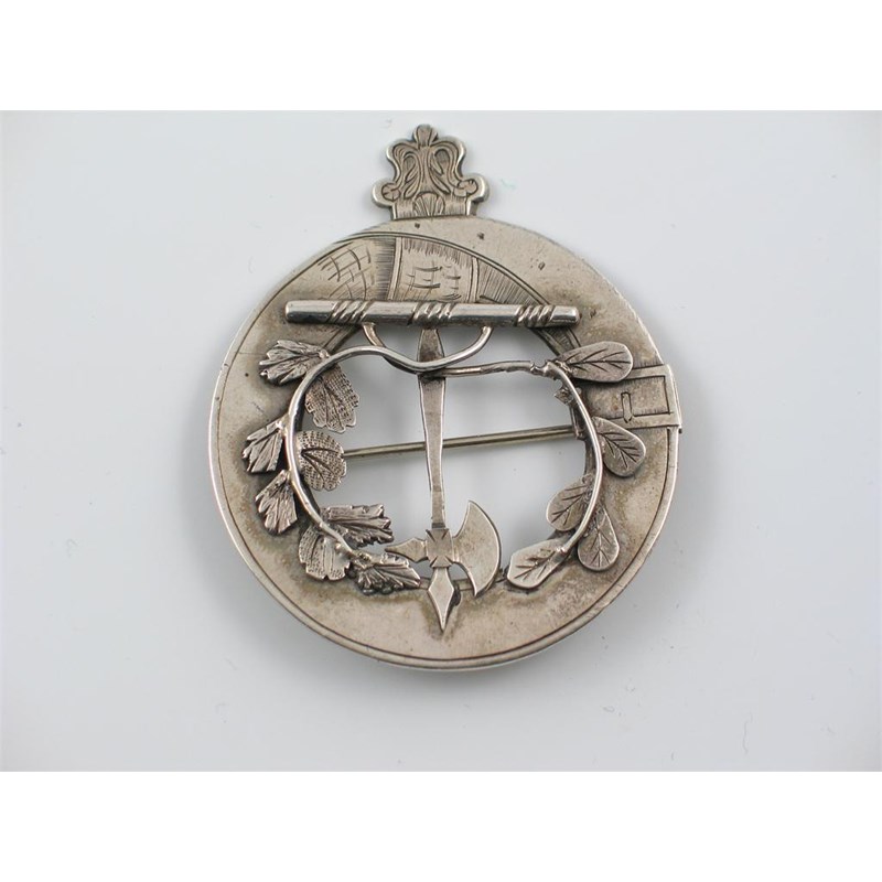 Scottish Clan Badge, for Maclean, an early and perhaps provincial Scottish specimen, c. 1850's-1860's, battle axe between cypress and laurel branches, the garter details engraved, 66 x 55mm.