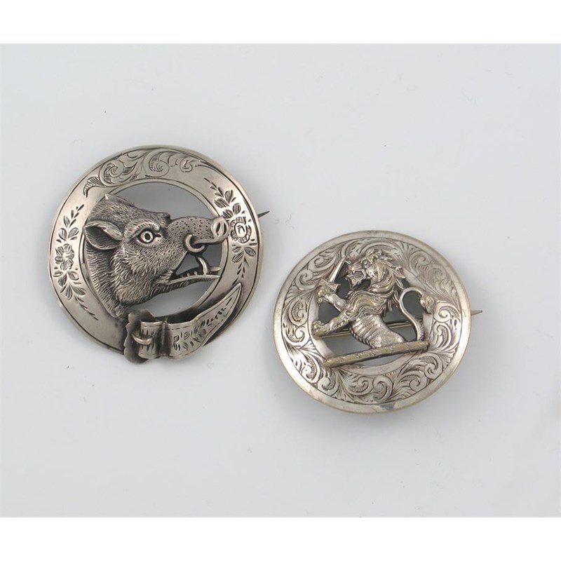 Scottish Clan Badge or brooch, perhaps MacDuff, demi-lion left with short sword, engraved scrolled circular border, 45mm; another, a boar's head to right, 'Garter' border engraved with floral sprays and scrolled acanthus leaves, 50mm, both mid to late Victorian. (2)