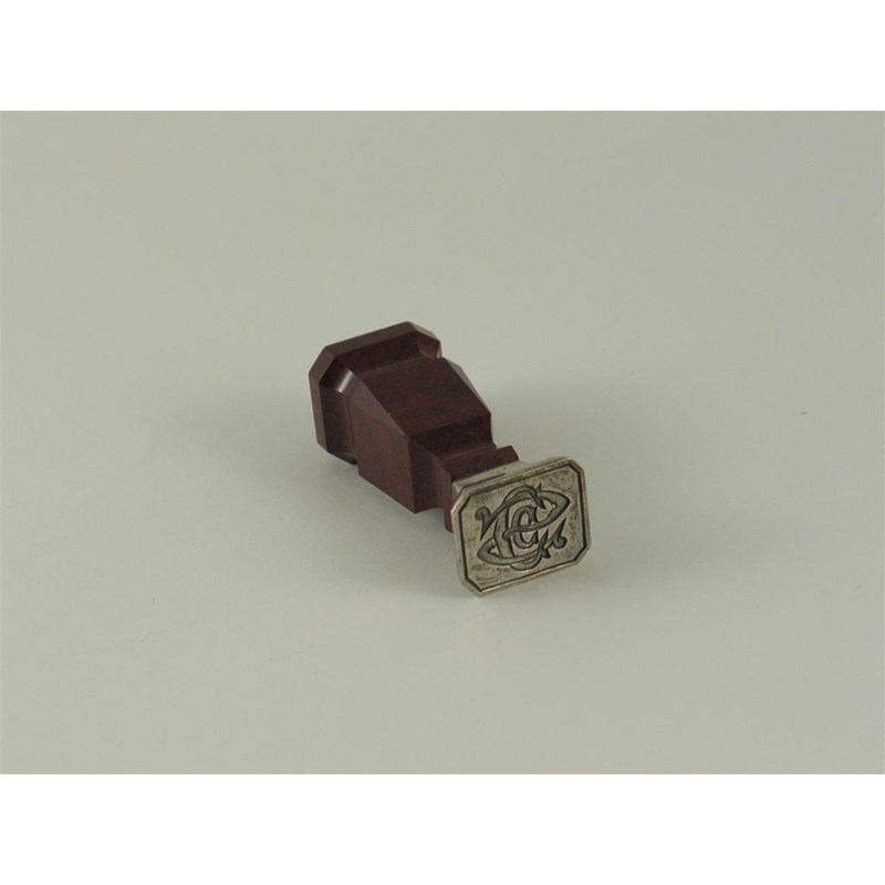 A Victorian mounted red hardstone desk seal, of faceted form, double-ended with an intaglio monogram and a crest and motto, 2.5in (6.6cm) high.