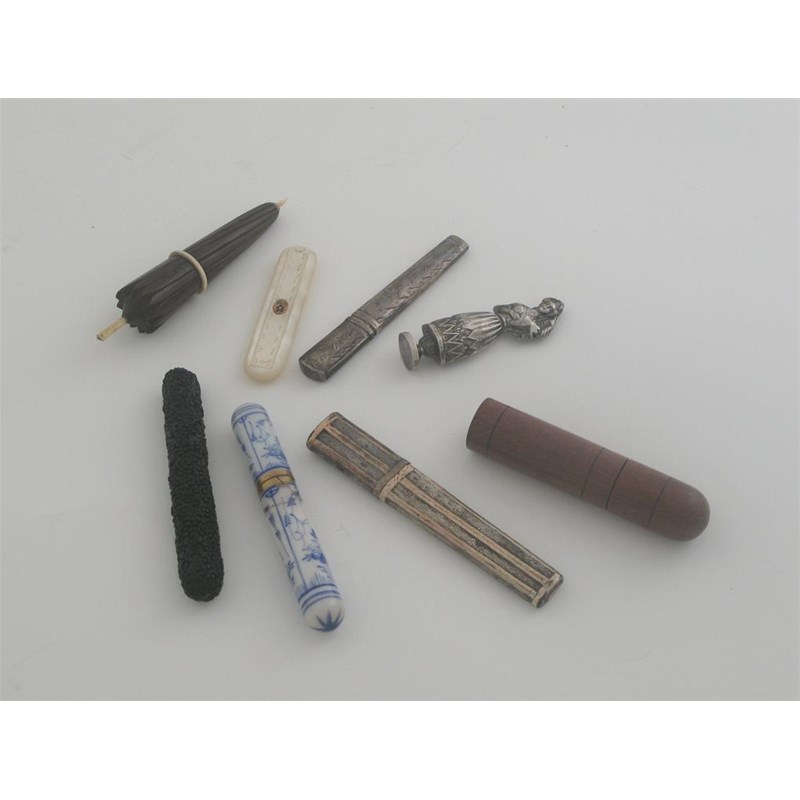 Eight various needle cases: a Palais Royale case with slide cover, a porcelain example, an engraved example, by Joseph Taylor, a continental figural example, an engraved parcel-gilt example, a wood and ivory 'parasol', a turned wooden example and a carved wooden example. (8)