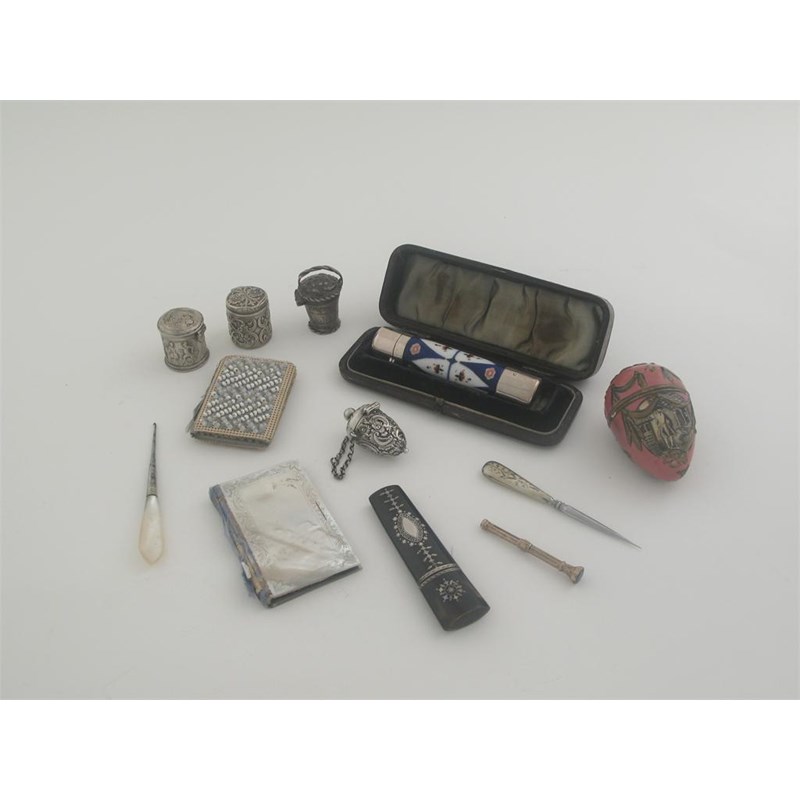 Miscellanea: a Dutch thimble 'basket', a late Victorian thimble case with embossing, an inlaid tortoiseshell needle case, two small boxes, two piercers (with steel points), a mounted porcelain scent tube (in a case) a mother of pearl needle case, a beadwork needle case, a gilt metal telescopic pencil and a papier mache, painted egg box "a present from the Bath". (12)