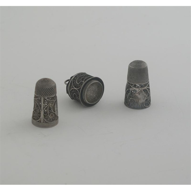 A George III filigree etui, with a detachable thimble and tape measure at the other end, initialled and lacking glass bottle, and a filigree work thimble, both unmarked both Birmingham c.1800. (2)