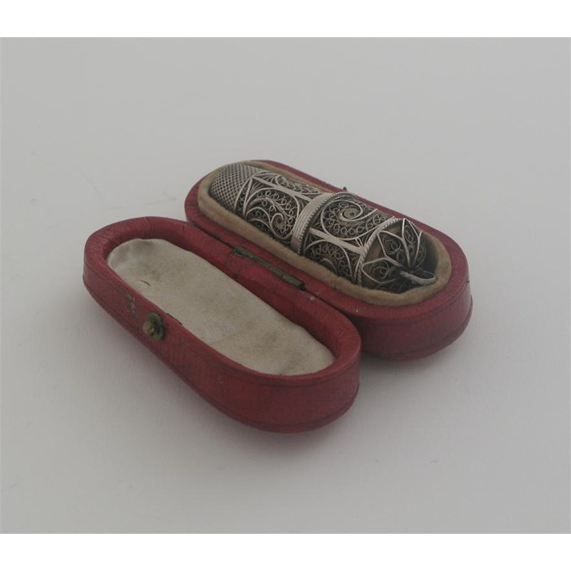A George III filigree etui, with a detachable thimble, glass scent with stopper and tape, unmarked, Birmingham c.1800 (original fitted case), 2.5in (6.3cm) long.