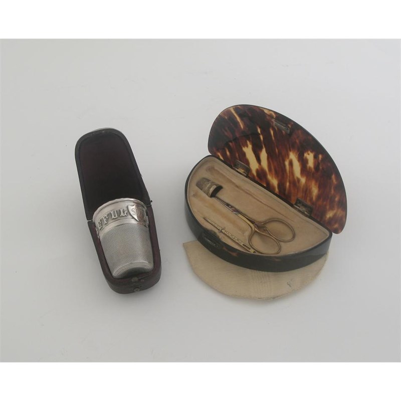 A modern mounted tortoiseshell sewing etui, of demi-lune outline containing only a thimble, gilt metal scissors and a bodkin, together with a "thimblefull" tot beaker, initialled "ST" by George Unite, Birmingham 1885 (in a fitted case), the later 2.25in (5.5cm) high. (2)