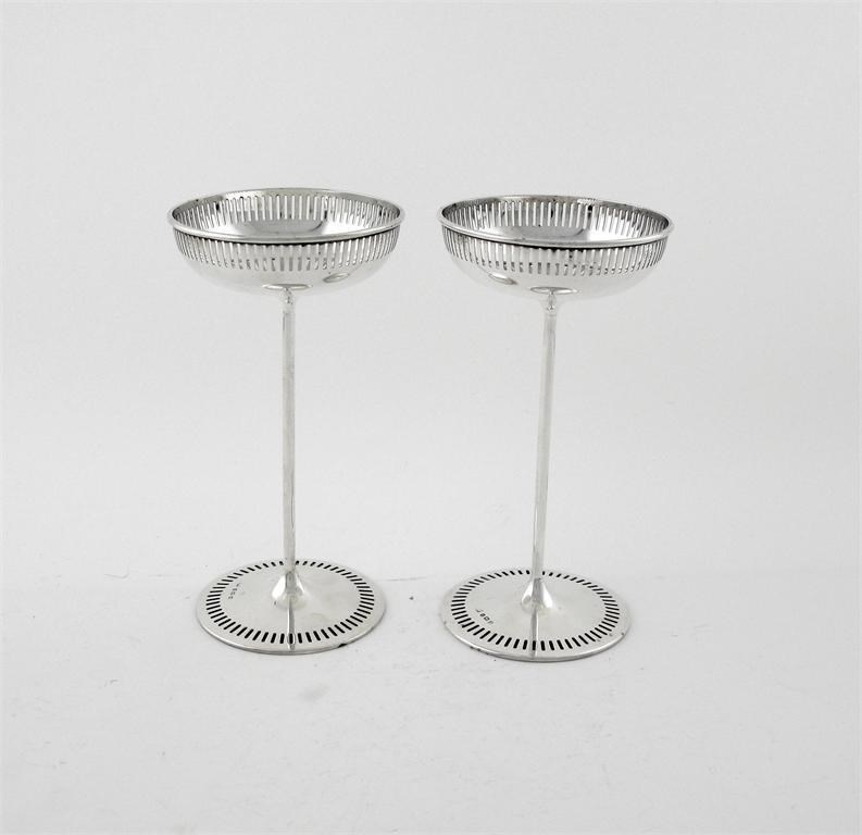 A pair of modern pierced dishes, on long stems, by Mappin & Webb, Birmingham 1911, 6.75in (17cm) high, 7.5oz. (2)