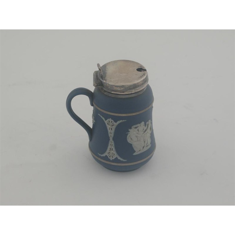 An Edwardian mounted Wedgwood jasperware mustard pot, maker "BDW", Birmingham 1904, 3.2in (8cm) high.