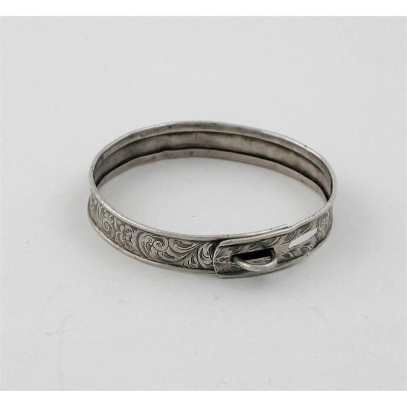 An early Victorian, small engraved dog collar, with an adjustable clasp, and a cartouche on one side, inscribed with the name of the dog "Boz" and the owner "Mrs Hoare", unmarked c.1840, 2.75in (7cm) diameter - at its largest, 0.5oz.