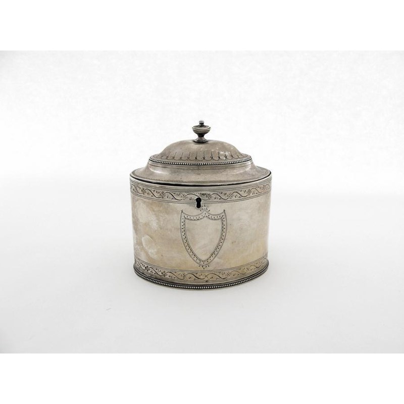 A George III tea caddy, with bead borders, an upper and lower engraved frieze with pricking and a vacant shield cartouche on the front and back, the cover with a vase-shaped finial by Peter & Ann Bateman, London 1791, 5.5in (14cm) high, 9.5oz.