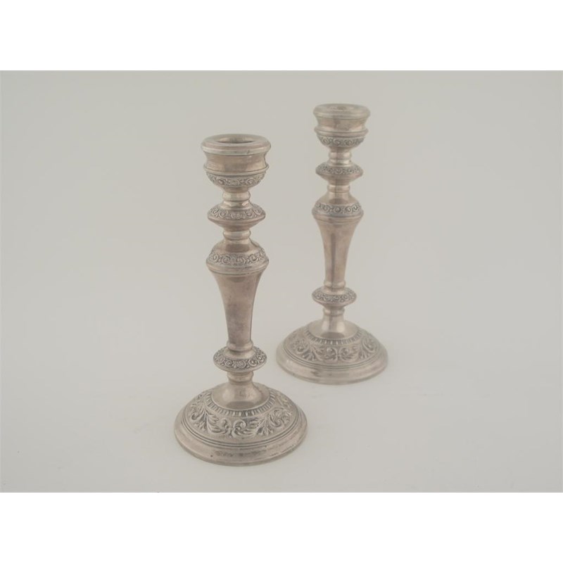 A pair of modern candlesticks, with round bases and embossed decoration (loaded), 8.9in (22.5cm) high. (2)