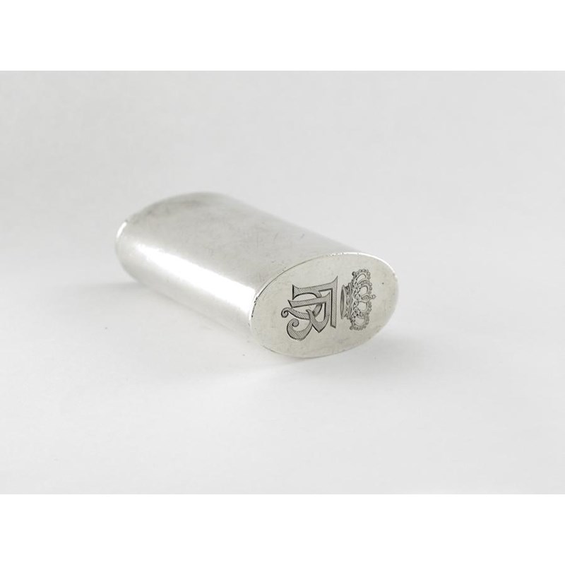 A Victorian vesta case, of plain, oval tubular section with a snap cover, initialled HB [monogram] below a crown, gilt interior and ridged bases with large ring by W. Wright & F Davies, London 1888, 2.45in (6cm) high, 2oz.