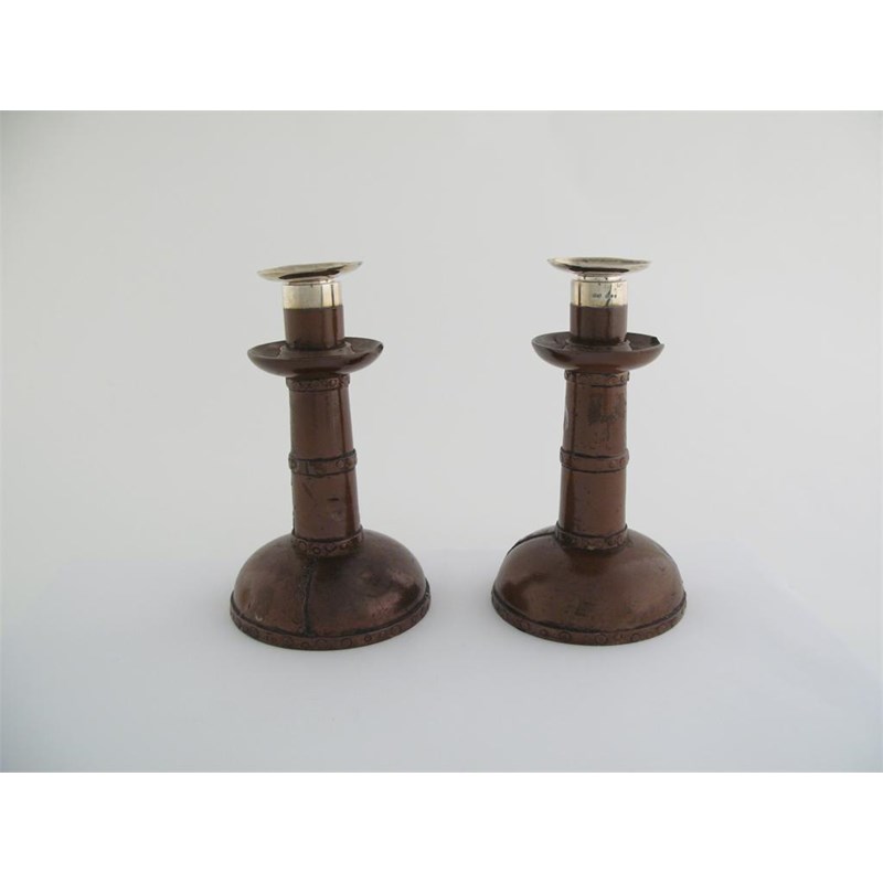 A pair of unusual, late Victorian arts & crafts candlesticks, mounted "Doulton Lambeth Silicon" pottery imitating rivetted copper with domed bases and drip pans, maker Henry Titterton Brockwell, London 1892, 7.2in (18cm) high. (2)