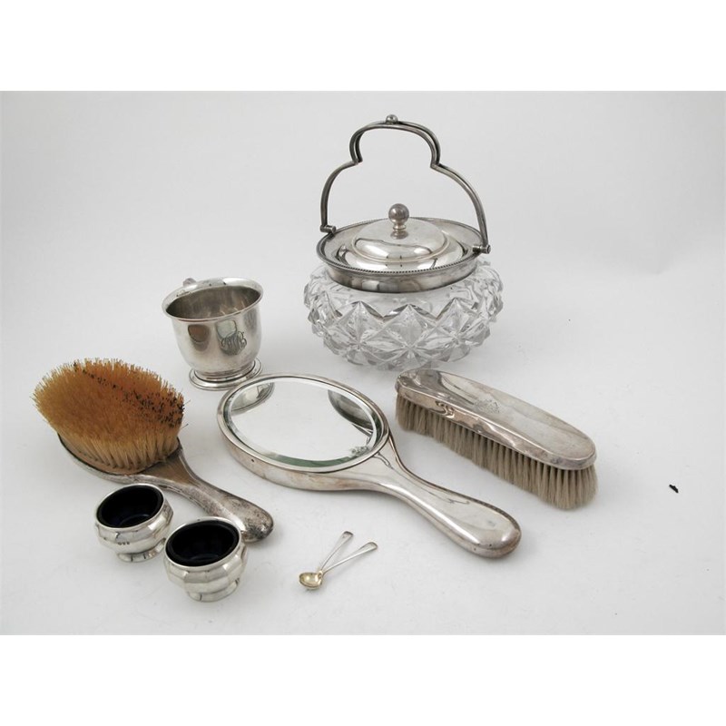 A mixed lot: a modern hand mirror, clothes brush and matching hair brush, a modern mug, a modern mounted cut glass biscuit box and cover with a swing handle and a pair of small salts with blue glass liners and spoons. (8)